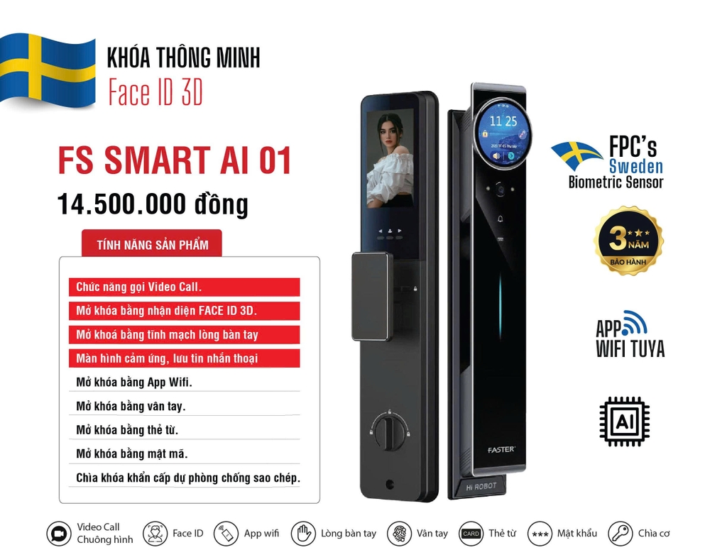 Khóa thông minh FS SMART AI 01 chinh phục người dùng bằng tổ hợp công nghệ sinh trắc học tiên tiến gồm nhận diện khuôn mặt 3D, nhận diện tĩnh mạch lòng bàn tay, và cảm biến vân tay FPC Thụy Điển – mang lại trải nghiệm mở khóa linh hoạt, chính xác và an toàn tuyệt đối. Với khả năng video call toàn thời gian, người dùng có thể giao tiếp trực tiếp với khách đến mà không cần họ phải nhấn chuông, đồng thời mở khóa từ xa qua ứng dụng Tuya, giúp kiểm soát an ninh dù đang ở bất kỳ đâu.