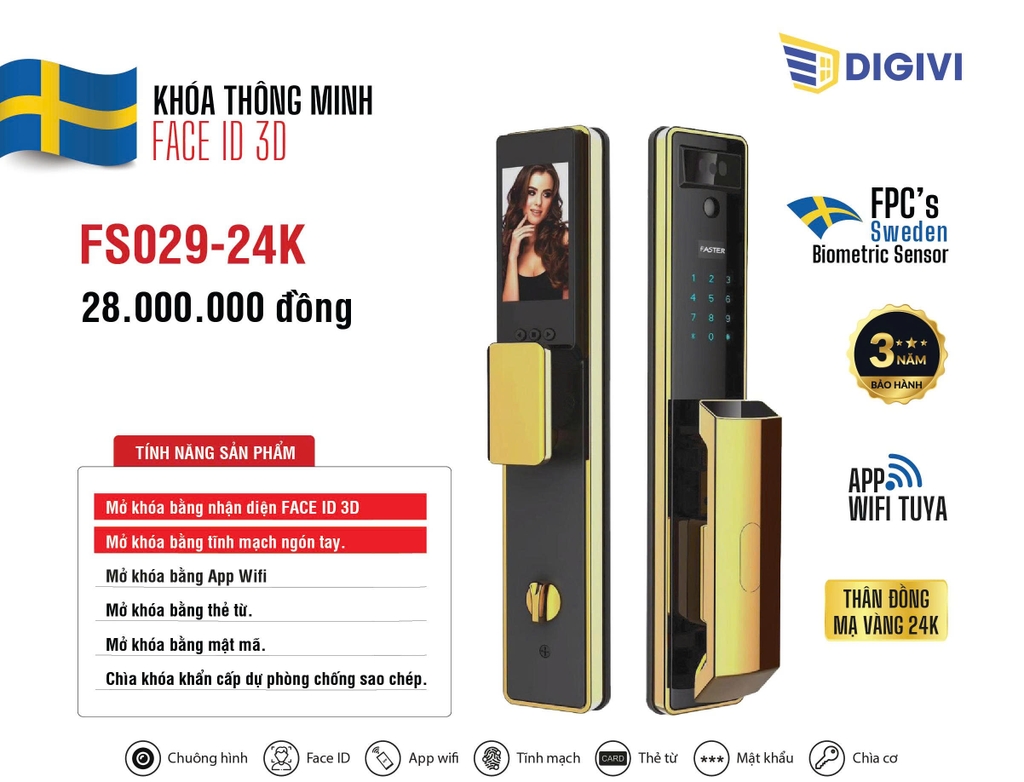 Khóa thông minh FS029-24K nổi bật với thiết kế mạ vàng 24K sang trọng và hàng loạt tính năng an ninh hiện đại như: điều khiển từ xa qua app Tuya, tích hợp camera chuông hình hiển thị hình ảnh người bấm chuông, cảm biến tĩnh mạch ngón tay công nghệ Thụy Điển, mật khẩu ảo chống nhìn trộm, thẻ từ nhỏ gọn, chìa cơ chống sao chép, cảnh báo đột nhập, thoát hiểm từ bên trong và bo mạch chống ẩm. Sản phẩm hỗ trợ lưu trữ lên tới 100 vân tay, 100 mã số và 100 thẻ từ, đáp ứng linh hoạt cho mọi nhu cầu sử dụng. Điểm nhấn đặc biệt của FS029-24K chính là chế độ bảo hành lên tới 3 năm – một cam kết mạnh mẽ về chất lượng, độ bền và dịch vụ hậu mãi, giúp người dùng yên tâm sử dụng lâu dài mà không lo chi phí phát sinh.
