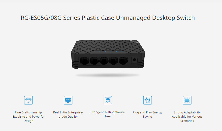 - Dễ dàng cài đặt và sử dụng: Là switch mạng không quản lý, RG-ES05 không yêu cầu cấu hình phức tạp, chỉ cần cắm và sử dụng, phù hợp với mọi đối tượng người dùng.