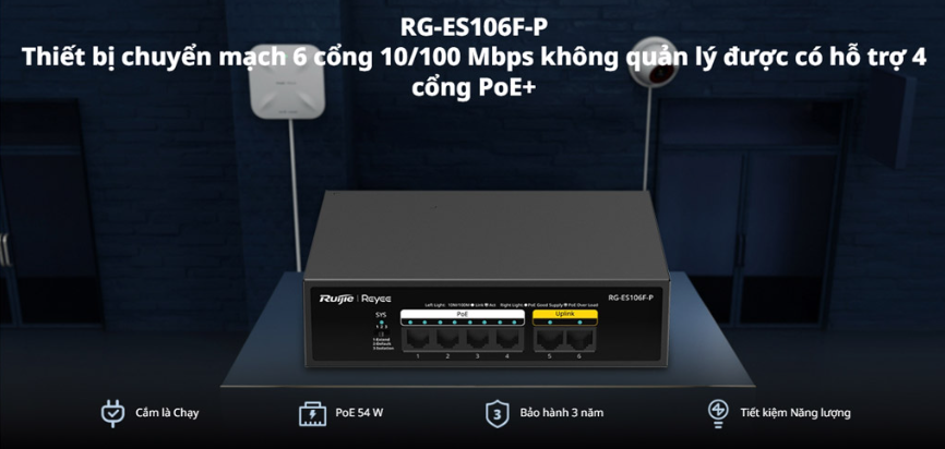 - Tiết kiệm không gian: Thiết kế nhỏ gọn và chất liệu vỏ kim loại giúp RG-ES106F-P dễ dàng lắp đặt và bố trí trong không gian nhỏ, tiết kiệm diện tích.